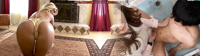 MILF in a golden swimsuit needs a cock in her shaved pussy and hatch