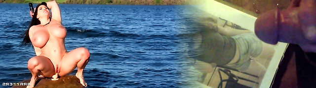 Mature dark haired Korina Kova plays with her massive knockers in outdoors
