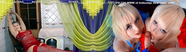Hot housewife Lukerya in her favorite crimson fishnet outfit shows off her sexy assets while dinking around with fans in the kitchen