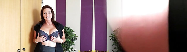 Buxom dark haired mature Milf Sarah Kelly masturbates in high heels