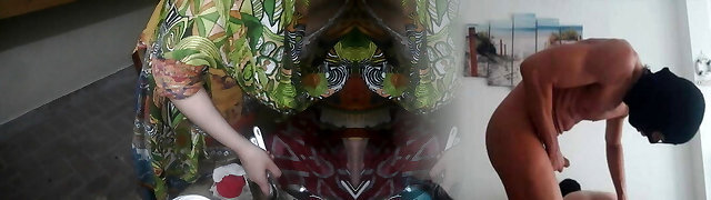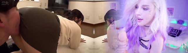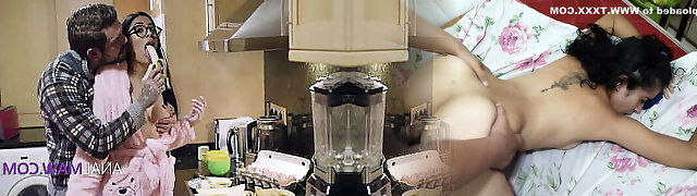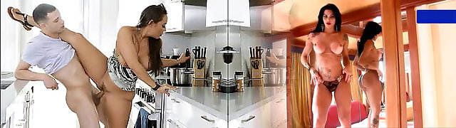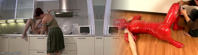 He finds stepmom and a gal have lesbian fucky-fucky in the kitchen