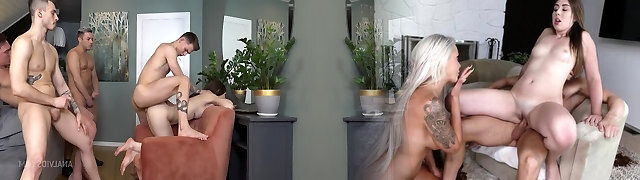Two busty and horny German ladies sharing two firm peckers in the living room