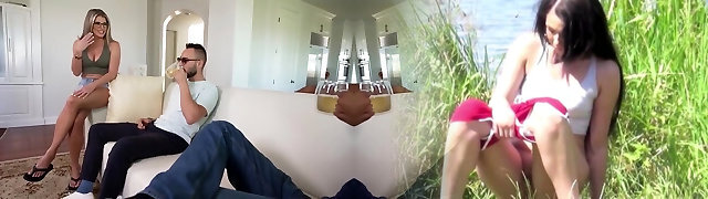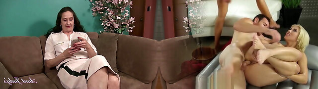Step-mom lends him her beautiful round ass to rub, jack and cum on top of her