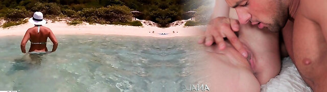 On the beach, I shave my wooly pussy while my buddy's stepson records me and strokes