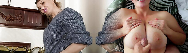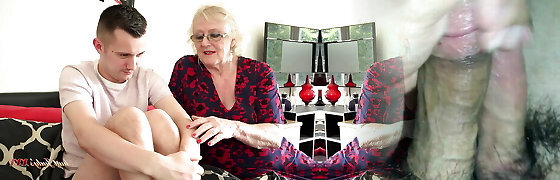 Busty 66yo GILF Mrs. Claire Catches Her Stepson's Mate in Her Couch