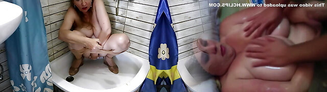 My wife putting one, two and three frigs in her hairy pussy