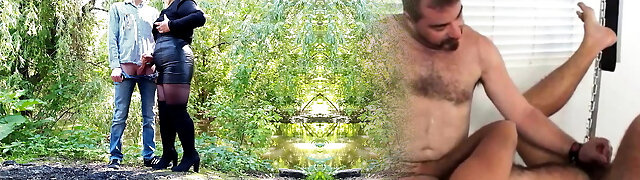Cougar in leather micro-skirt gets a load on her ass outdoors