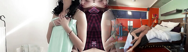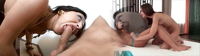 Cherry stud Peter slides his cock in foster moms Gia and Havanas Milf pussies
